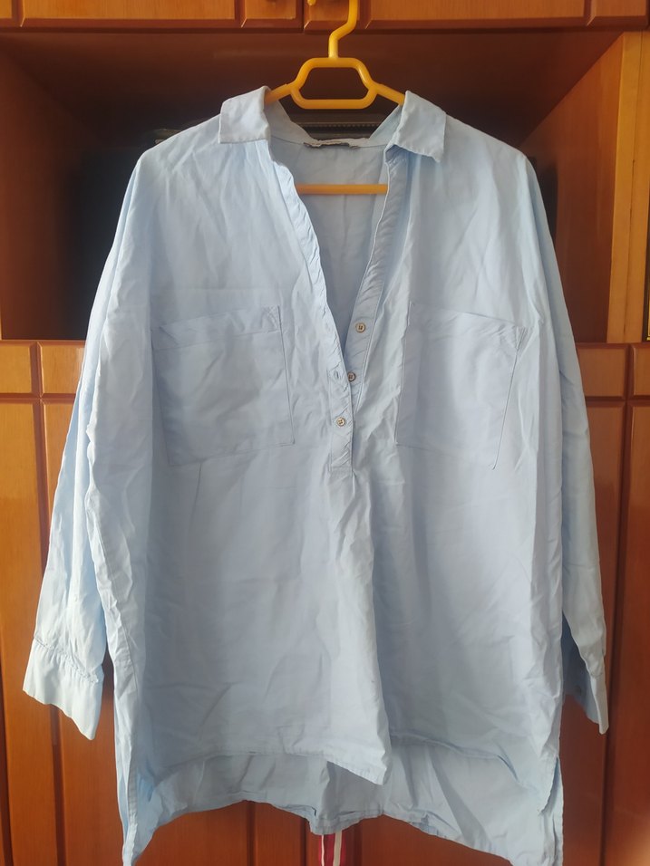 Salaş kesim, uzun kollu mavi keten gömlek. Yaka ve düğmeli detaylarla günlük kullanıma uygun, midi boyda rahat bir parça.