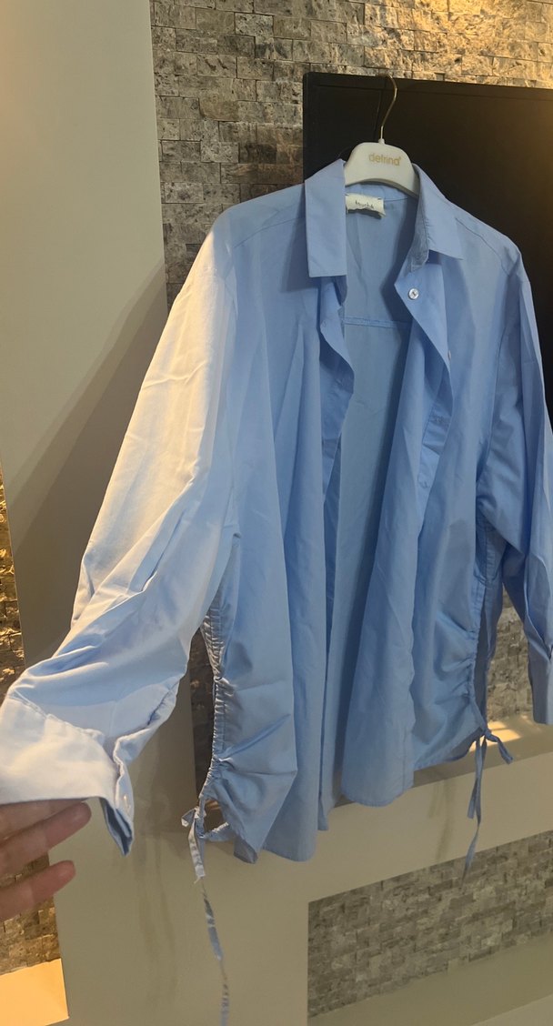 Sorunsuzdur. Dolap fazlalığı giymiyorum Mavi keten, uzun kollu, yakalı ve düğmeli salaş kesim gömlek. Yanlarda bağcık detayları bulunur, ofis kullanımı için uygundur.
