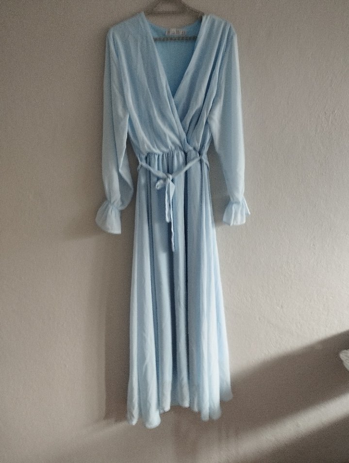 Pastel mavi keten kumaştan, V yakalı ve uzun kollu, drapeli uzun elbise. Belden bağlamalı, bol kesim, minimal bohem tarzıyla klasik şıklık sunar. kolları tül detaylı 1 kez giyildi sadece