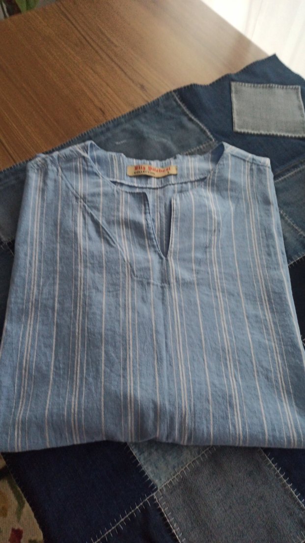 Mavi keten kumaştan, V yakalı, kısa kollu ve hafif çizgili bol kesim erkek gömleği Günlük rahat ve şık kullanım için idealdir.