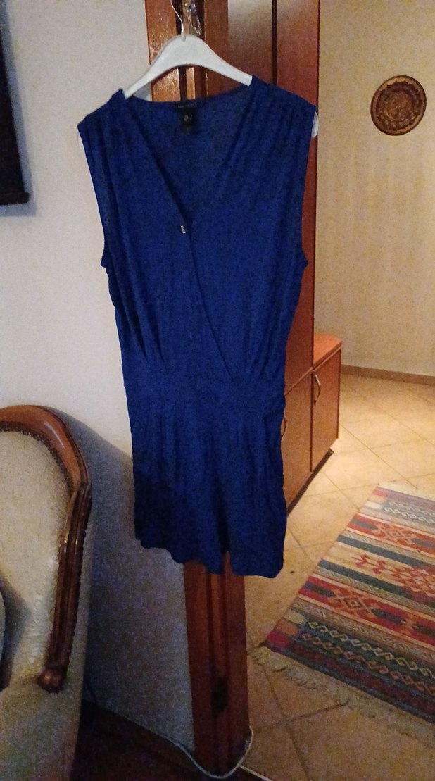 Keten kumaştan, kolsuz, drapeli V yaka ve dar kesime sahip mavi tulum. Rahat günlük stil için uygundur.