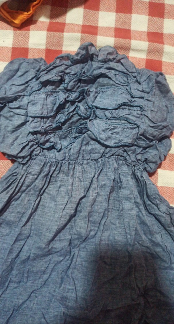 Mavi keten bluz, volan detaylı, askısız yaka ve bol kesim. Kolsuz tasarımı günlük kullanım için uygundur, bohem tarzda. profilimde aynısının pembesi var orda detay verdim isterseniz bakabilirsiniz