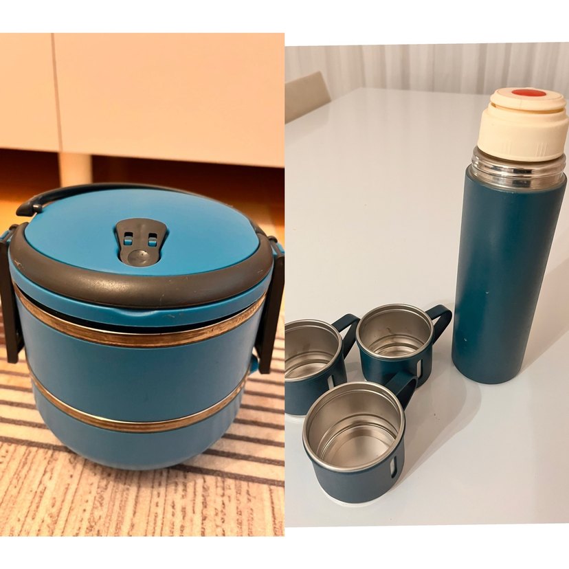 İki bölmeli, kilitli kulplu mavi yemek kabı. Kolay taşıma ve pratik yemek saklama sağlar. Termos da sayılı kullanılmıştır sorunsuz