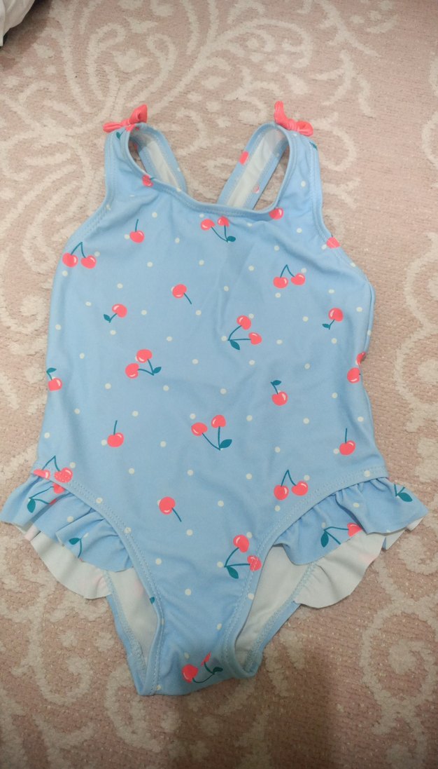 Mavi kiraz desenli, kolsuz kız çocuk mayosu, yanlarda fırfır detaylı, plaj için uygundur. bir yaş kiz bebek mayosu hic kullanilmadi. bnce 6 aydan snra giydirilir