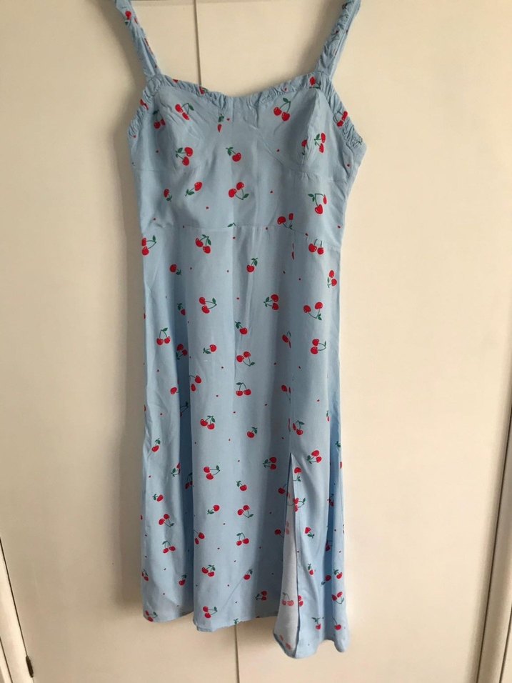 Kiraz desenli mavi elbise, %100 cotton, Large beden ancak dar kalıp bu yüzden s ve m bedene daha uygun.. yırtmaçlı.. aldığımda minik bir kumaş leke hatası vardı..yan tarafı biraz zorlayarak giydiğimden sökülmüş.. kilo alımına bağlı elden çıkarıyorum #kirazlıelbise #elbise #mavielbise #meyvelielbise