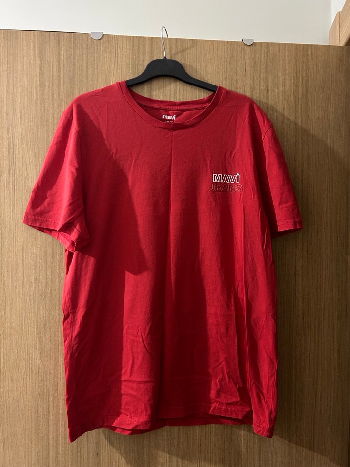 Kırmızı renkli, pamuklu kumaştan, kısa kollu ve yuvarlak yakalı, bol kesim erkek tişörtü. Küçük baskılı logo detayıyla günlük kullanıma uygun. Ufak bir defosu vardır görselde yer alıyor onun dışında iyi durumdadır.