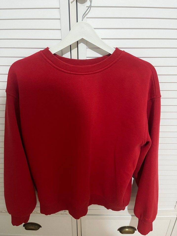 Kırmızı, yuvarlak yakalı ve uzun kollu kadın sweatshirtü, rahat bir oversize kesime sahiptir. Normal boyda ve parlak, düz dokulu kumaştan üretilmiştir. Günlük kullanıma uygun, sade ve rahat bir stildir.