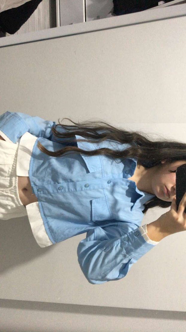 Pastel mavi renkte, yakalı ve uzun kollu, düğmeli kısa boy denim gömlek. Rahat kesimiyle günlük sokak tarzına uygundur.