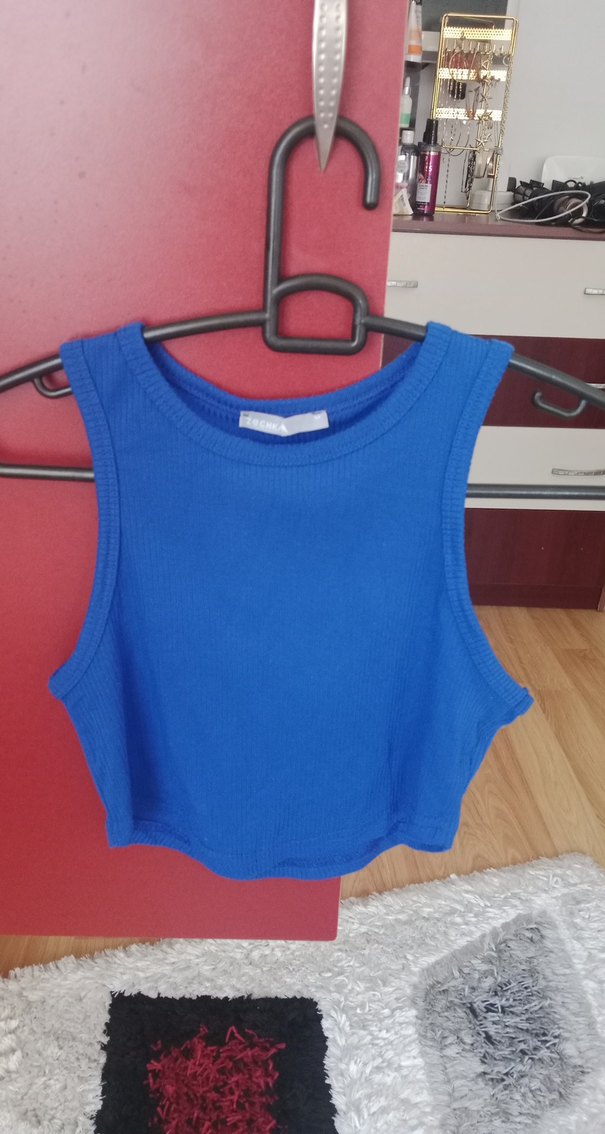 Mavi, kısa ve dar kesim kadın atlet, yuvarlak yaka ve kolsuz yapısıyla rahat bir şıklık sunar. Yumuşak sentetik kumaştan üretilmiştir.