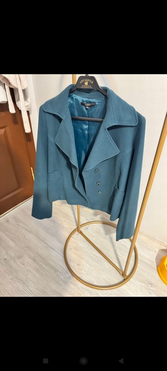 kaşe petrol mavisi kısa kesim kadın blazer, düğmeli ve keskin yakalıdır. Uzun kollu, parlak dokusu ile klasik ofis stiline uygundur. iki üç giyildi çok şık duran bi ürün bol geldiği için satışta