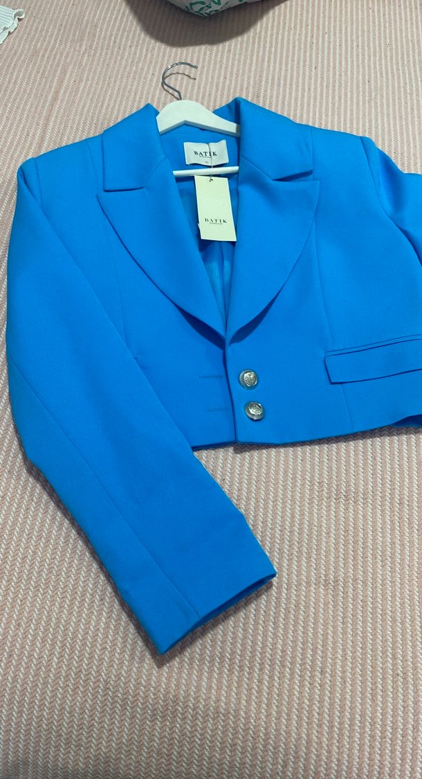 Mavi renkli, düğmeli kısa kesim kadın blazer ceket. Sentetik kumaştan, uzun kollu ve normal kesimdir. Ofis ve günlük şıklık için uygundur. ✨