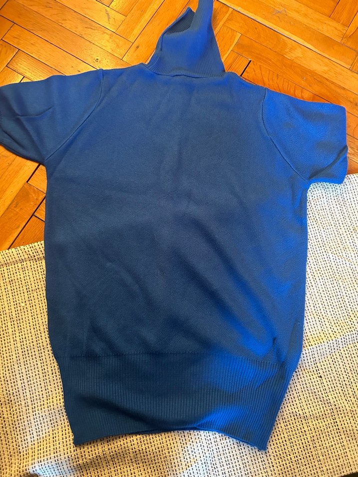 Mavi, parlak sentetik kumaştan kısa kollu, balıkçı yaka ve vücuda oturan kesime sahip örgü kadın kazak Small ve medium uyumludur