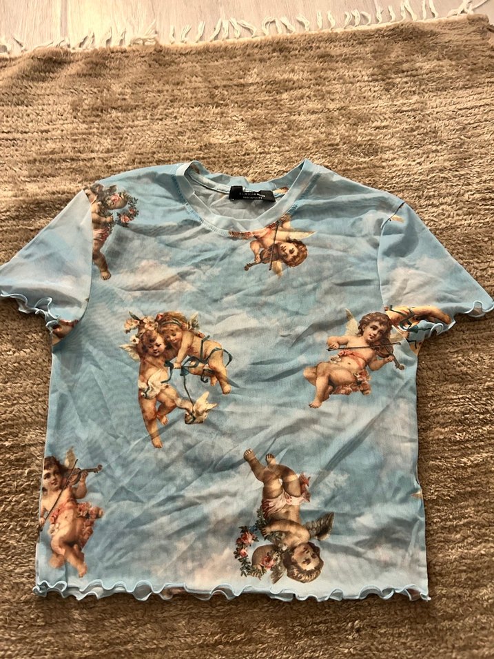Pastel mavi renkte, kısa kollu, baskılı kız tişörtü. Sentetik yumuşak kumaştan, bisiklet yaka ve buklem detaylarla bohem tarzda. İşine büstiyerle çok güzel duruyorr markasını hatırlamıyorum . Xs s m uyumludur