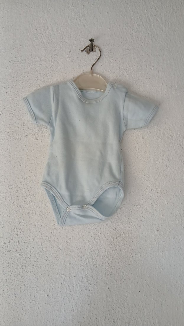 Pastel mavi renkli, kısa kollu, yuvarlak yakalı bebek body, yumuşak ve sıcak kumaştan yapılmıştır, sade ve rahat bir tarza sahiptir.