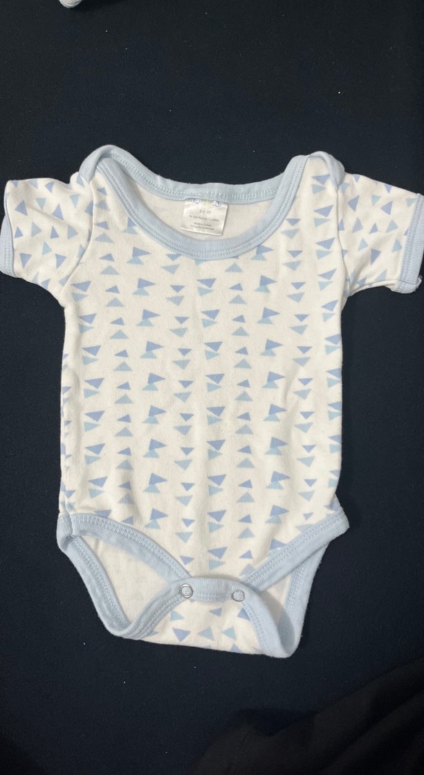 Pastel mavi renkli, kısa kollu ve V yakalı bebek body. Pamuklu, yumuşak kumaştan, geometrik desenli ve streetwear tarzında.