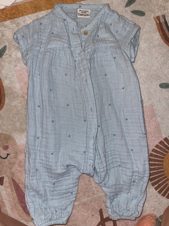 Mavi renkli, kısa kollu ve yakası kesik bebek tulumu. Yumuşak müslin kumaştan, düğmeli ve bohem tarzda.