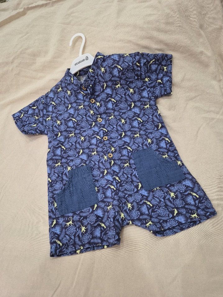 Kısa kollu, mavi renkli, renkli batik desenli, düğmeli ve boğazlı bebek tulumu. Sadece bir kere giyildi. %100 pamuk.