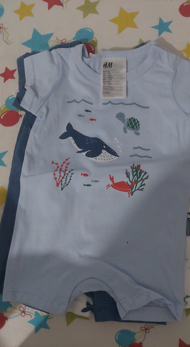Kısa kollu, bisiklet yaka ve deniz temalı baskılı mavi bebek tulumu, yumuşak sentetik kumaştan üretilmiştir.