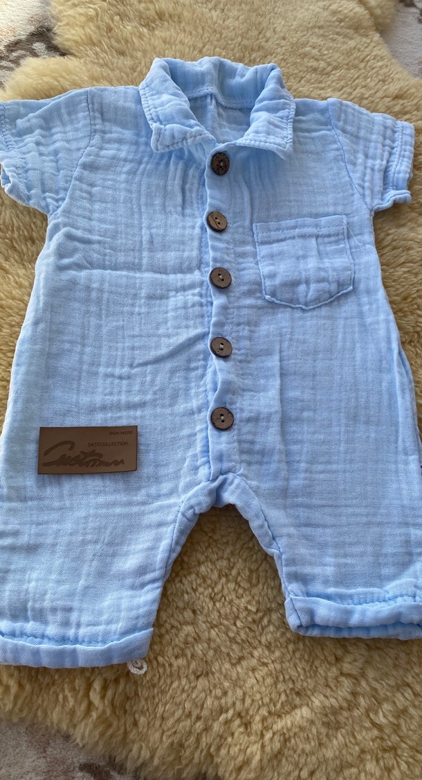 Pastel mavi renkte, kısa kollu, düğmeli ön ve kesik yakalı bebek tulumu. Yumuşak keten kumaştan, bohem tarzda, küçük göğüs cebi ile rahat kullanıma uygun.
