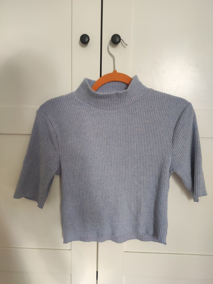 Bu mavi triko kazak, kısa kollu ve boğazlı tasarımıyla günlük kullanıma uygun, trend ve rahat bir görünüme sahiptir. Yumuşacık crop kazak.