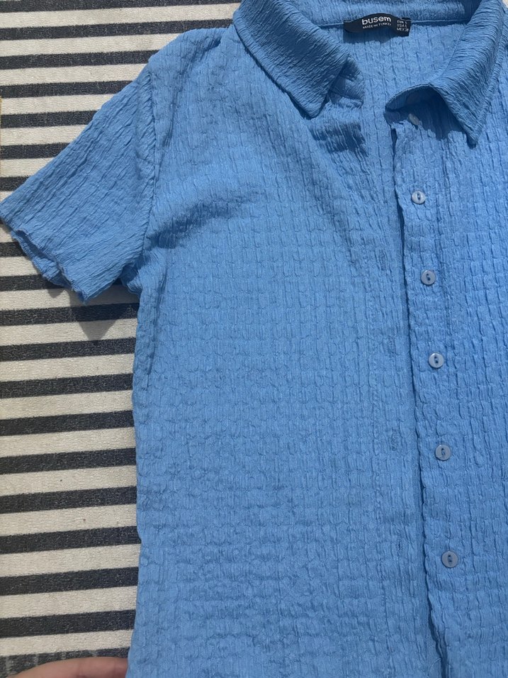 Mavi büzgülü gömlek, kısa kollu, yakalı ve düğmeli. İnce kesim ve normal uzunlukta, günlük rahat sokak stili için uygun.