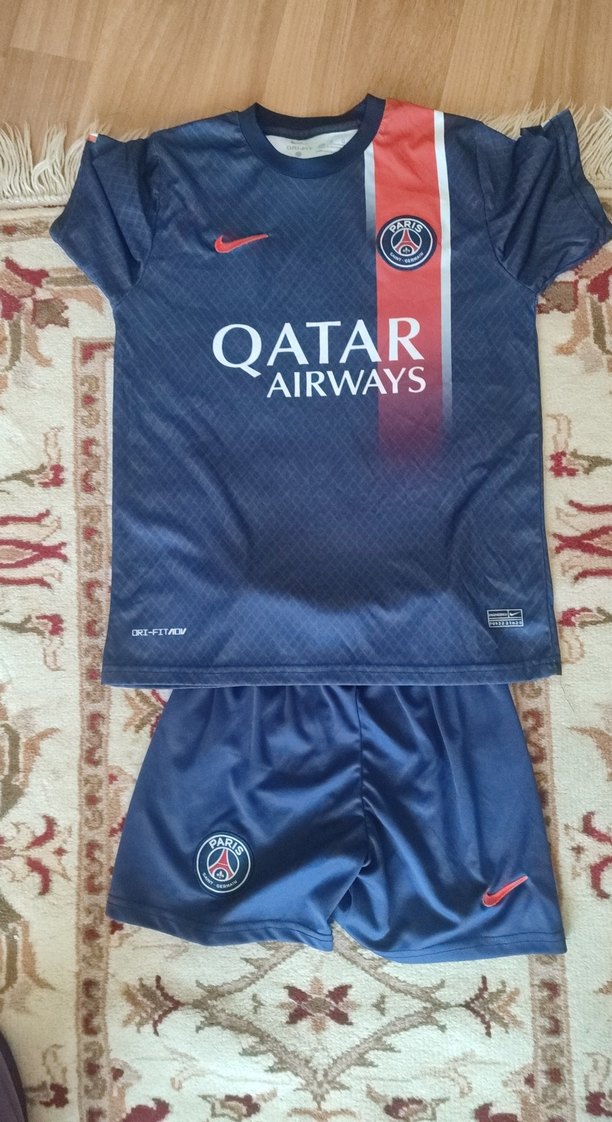 Kısa kollu, dar kesim erkek spor forması ve şort takımı, sentetik kumaştan üretilmiş. Koyu mavi, 'Qatar Airways' baskılı, atletik ve sokak tarzına uygun. ⚽