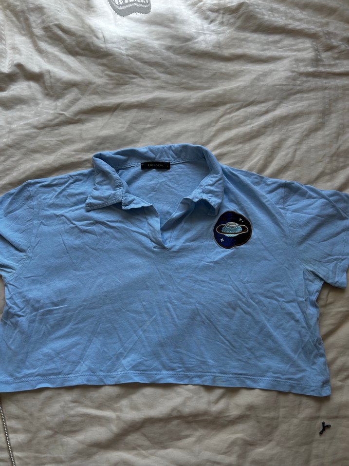 Bol kesim, kısa kollu denim gömlek. Yaka ve düğmeli, göğüste uzay temalı baskı bulunur. Günlük kullanıma uygun.