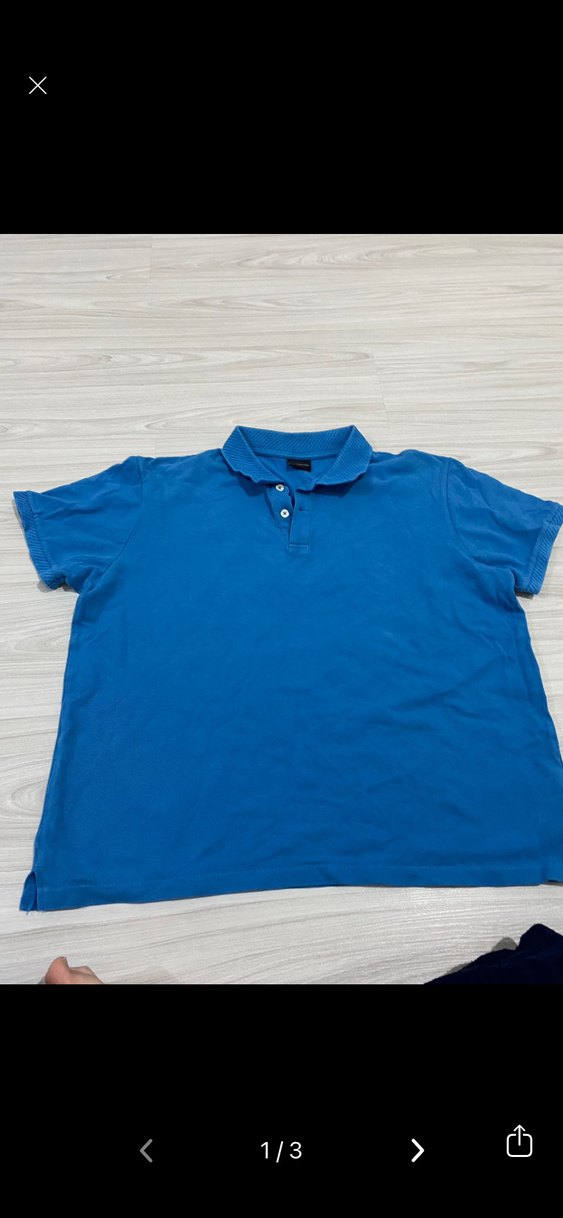 Mavi renkte, kısa kollu, yakalı, bol kesim ve normal boyda denim kumaştan yapılmış polo tişört. Rahat sokak stili için uygundur.