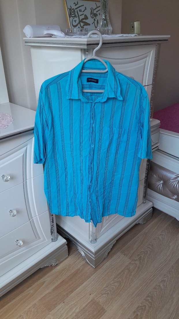 Bol kesim mavi kısa kollu erkek gömlek, yakalı ve düğmeli, parlak batik desenli pamuk kumaştan, günlük kullanım için uygundur.