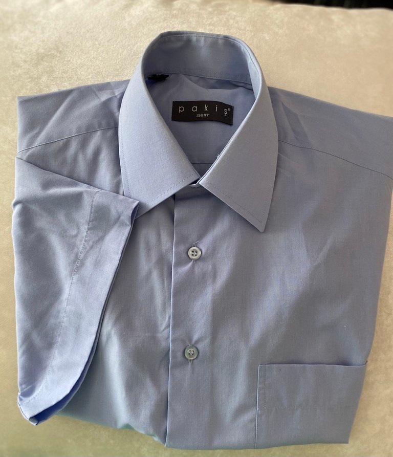 Mavi renkte, kısa kollu ve düğmeli iş gömleği. İpek gibi kumaştan, normal kesim ve cep detayıyla ofis kullanımı için uygundur. "pakis" etiketli.