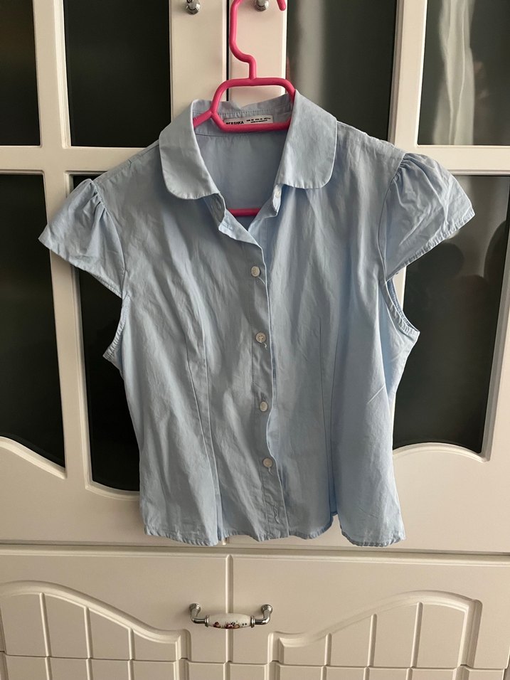 Mavi pastel renkte, kısa kollu ve düğmeli, yakalı, dar kesim kadın gömleği. Günlük sokak stili için uygun, yumuşak denim kumaştan üretilmiştir.
