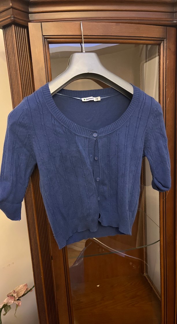 Mavi pamuk kumaştan, kısa kollu ve düğmeli ön kısmı olan, normal midi boyda, ince kesim kadın hırka. Günlük kullanıma uygundur.