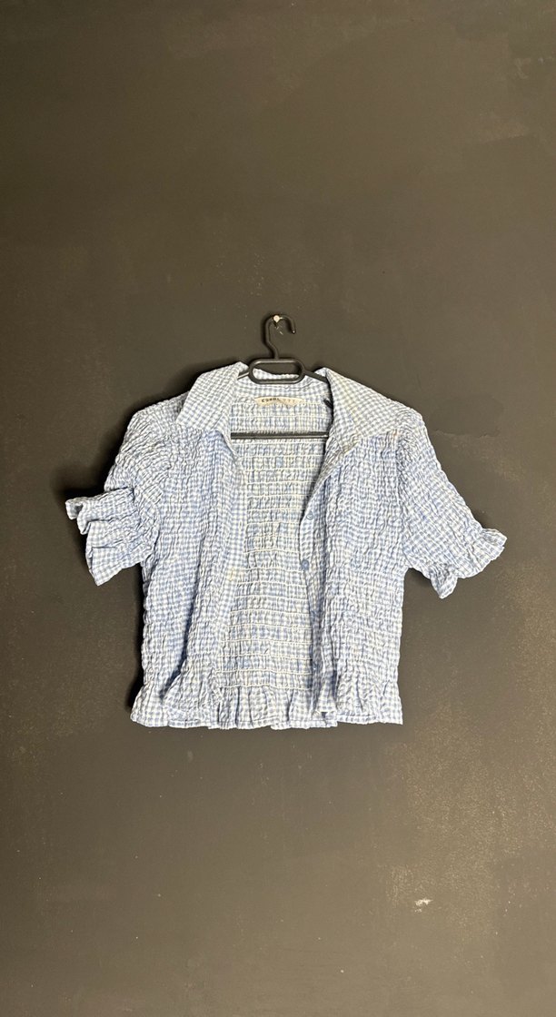 Mavi keten kumaştan, kısa kollu ve düğmeli, yakalı salaş kesim gömlek. Pastel tonlarda batik desenli, günlük kullanım için uygundur.