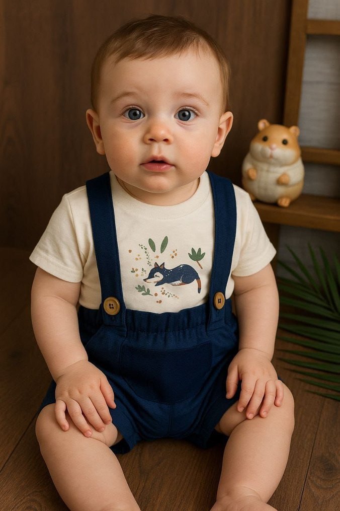 Pamuk kumaştan, kısa kollu ve bisiklet yaka bebek tulumu. Koyu mavi tokalı askılar ve baskılı ön kısmı ile sade ve rahat bir tasarım sunar. ⚡️ 6-9 Ay ⚡️ 9-12 Ay ⚡️ 12-18 Ay ⚡️ 18-24 Ay TAM KALIP⚠️