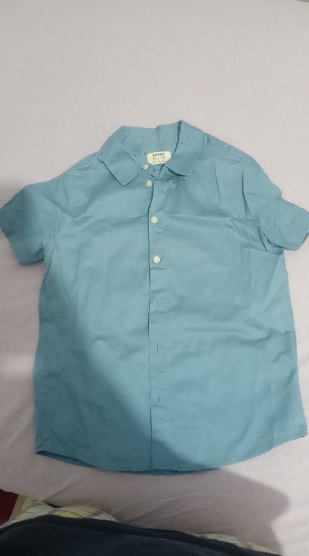 Mavi kumaştan, kısa kollu, yakalı ve düğmeli erkek çocuk gömleği. Regular fit ve sade tasarıma sahip.