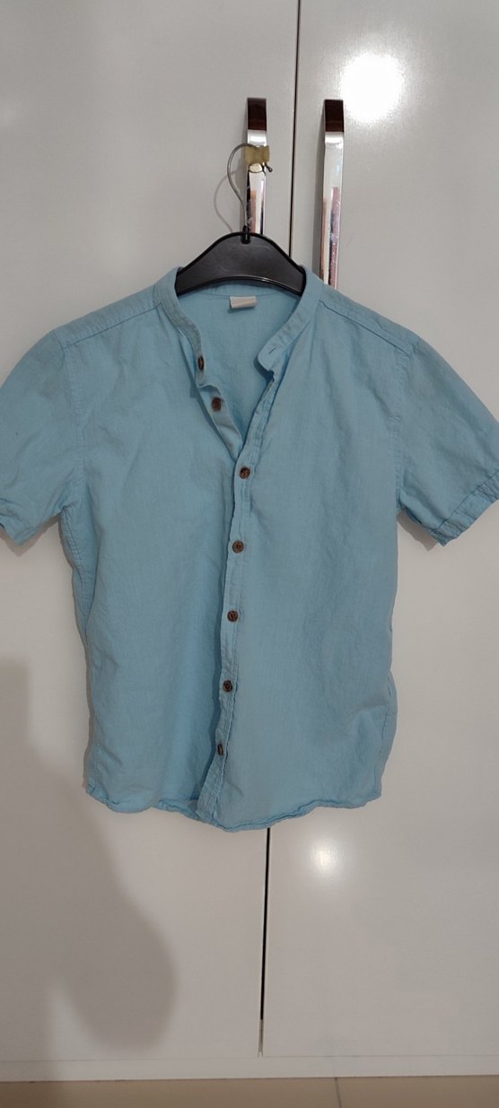 Erkek çocuklar için mavi keten gömlek, kısa kollu ve bol kesim. Düğmeli ve yakalı, rahat sokak stili için uygundur.