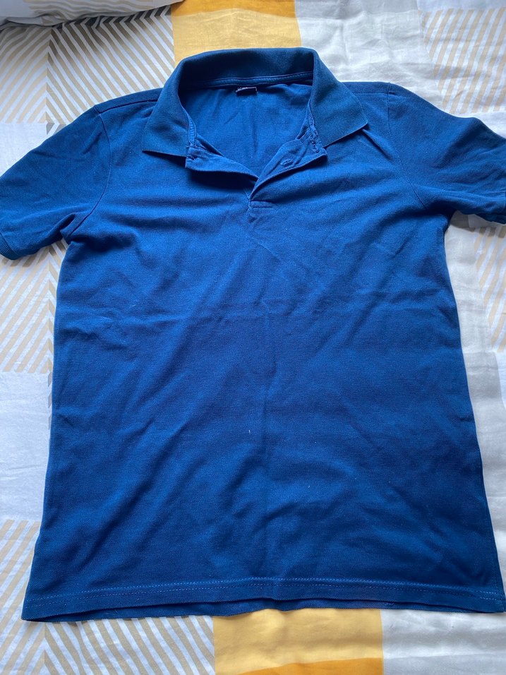 Düğmeli yaka ve kısa kollu, ince keten kumaştan yapılmış parlak mavi renkli, vücuda oturan erkek polo tişörtü. Günlük kullanıma uygun normal boyda.