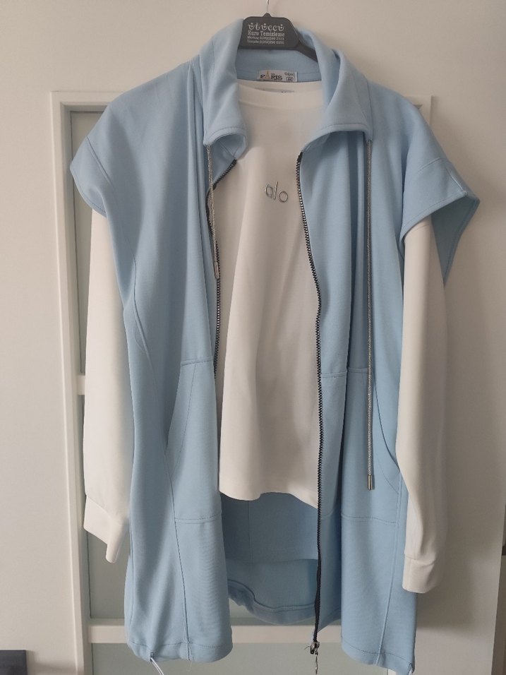 Pastel mavi renkli, kısa kollu ve fermuarlı bu kadın ceketi, bol kesim ve bisiklet yaka detayına sahiptir. Yumuşak ve sıcak kumaştan üretilmiş olup günlük rahat kullanıma uygundur. Ön kısmında cepler bulunur ve düz desensizdir. 'alo' yazısı yer almaktadır.