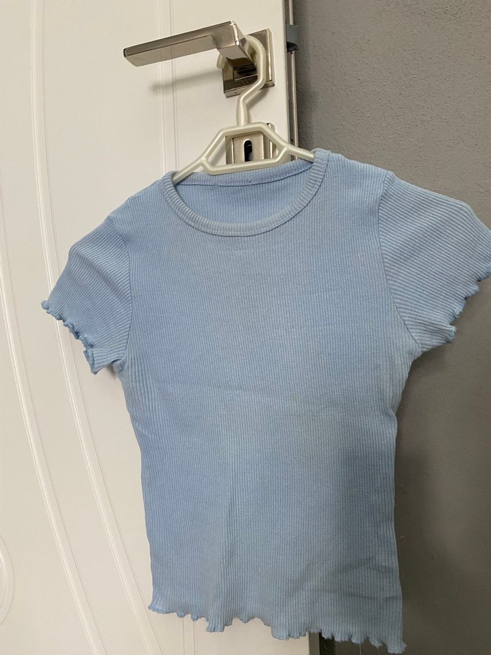Pastel mavi renkli, kısa kollu ve bisiklet yaka fitilli tişört. Yumuşak keten kumaştan, minimalist ve günlük tarz için uygun.