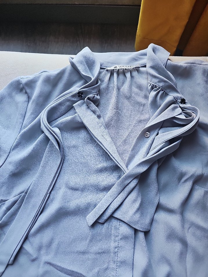 Mavi renkte, fular yaka detaylı kısa kollu bluz. Journey marka.