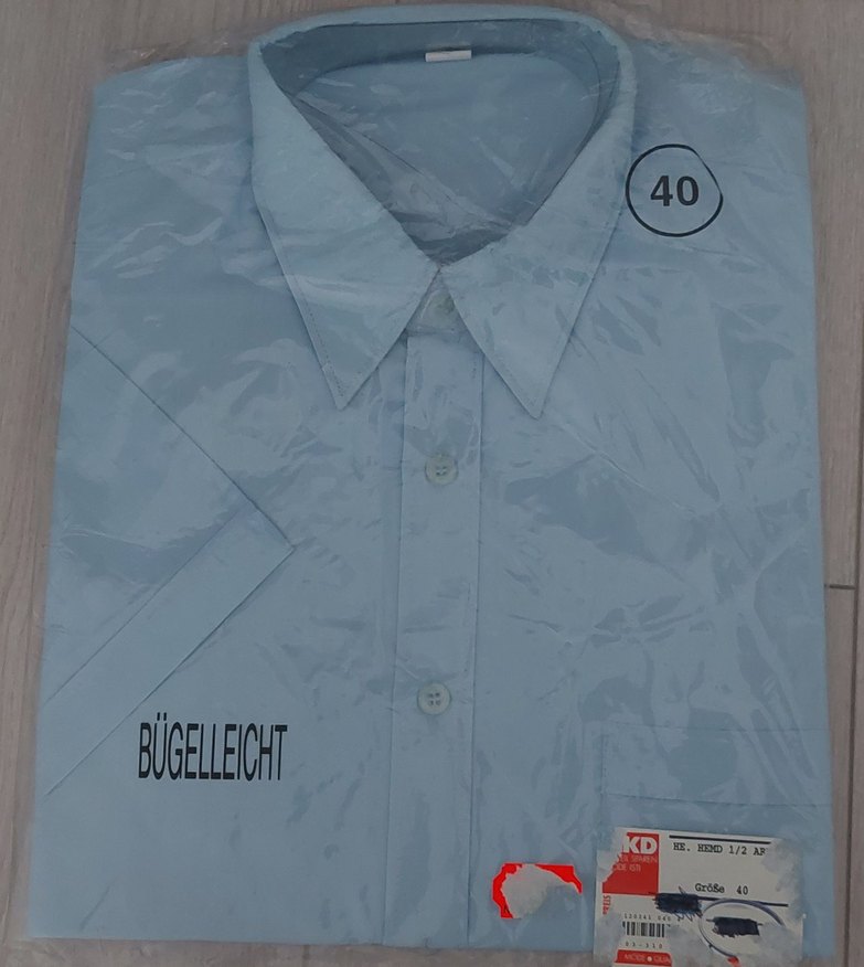 Açık mavi kumaş, kısa kollu, düğmeli ve yakalı gömlek. Normal kesim olup ofis kullanımı için uygundur. Beden 40.