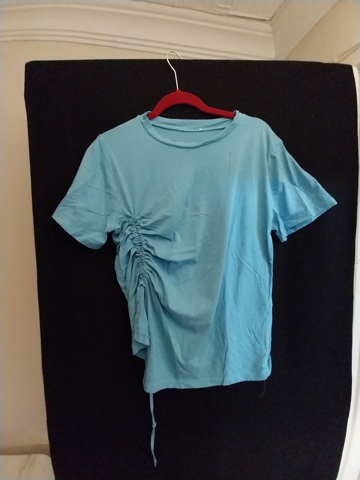 Nefes alabilen keten kumaştan, kısa kollu ve yuvarlak yakalı, yan kısmı drapeli pastel mavi hamile tişörtü. Rahat ve bol kesimdir.