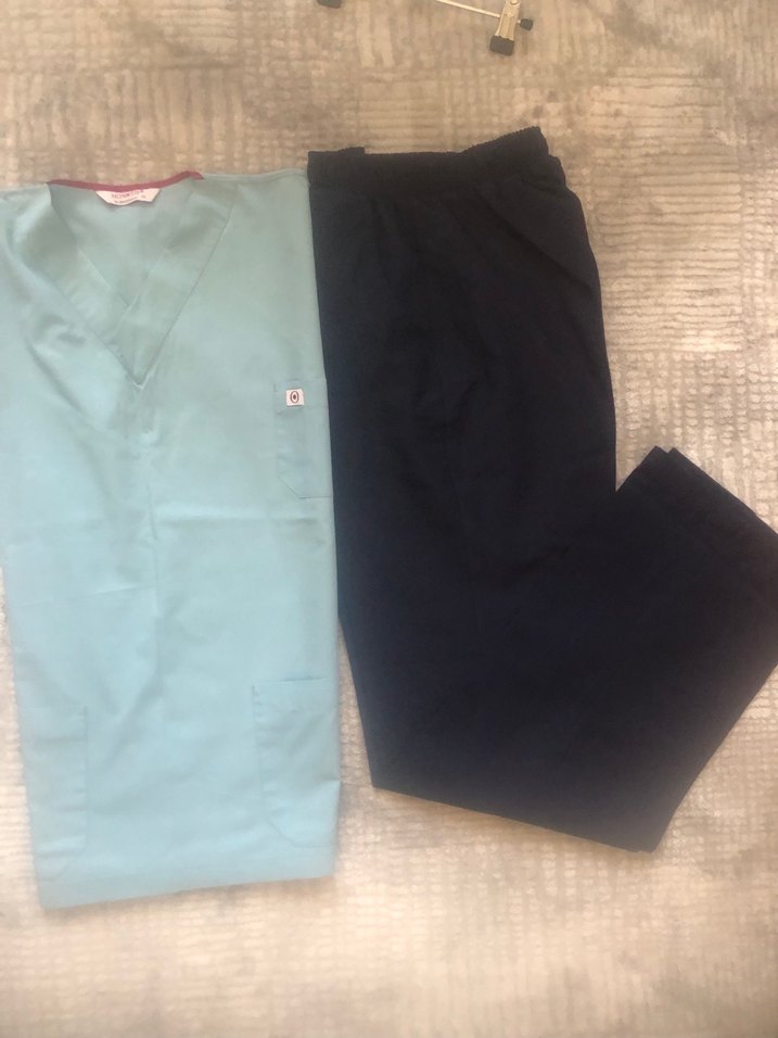 Yumuşak pamuk kumaştan yapılmış, koyu mavi kısa kollu üst ve eşofman altından oluşan hastane kıyafeti.