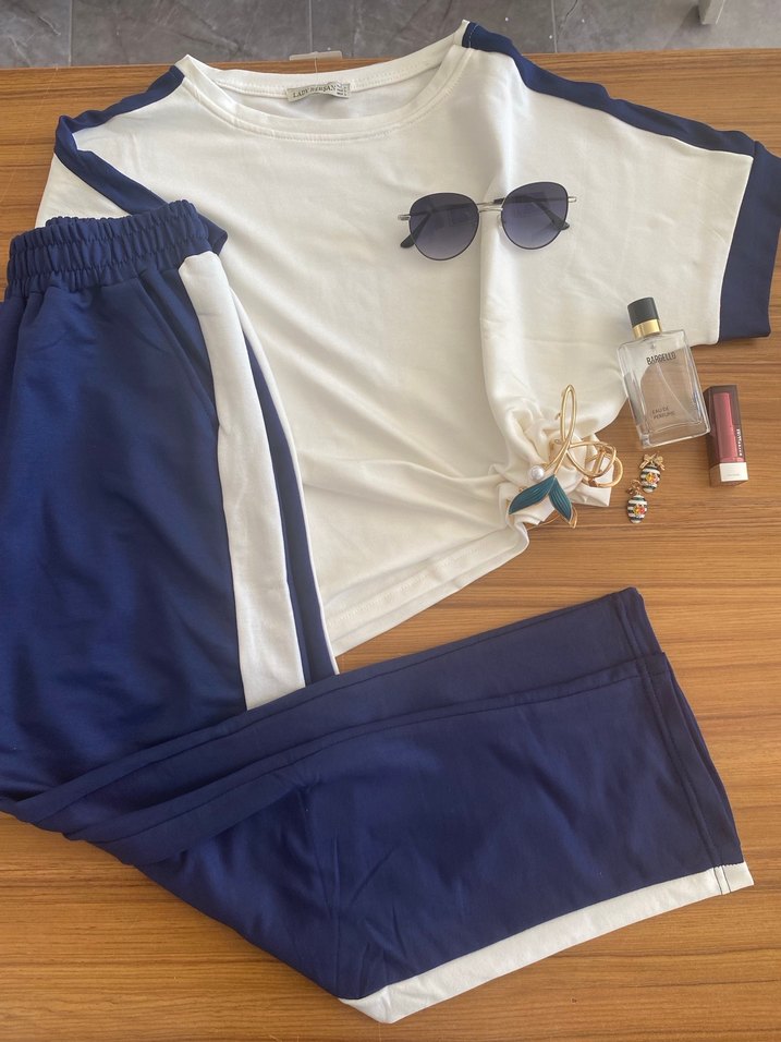 Pamuk kumaştan, kısa kollu ve bisiklet yaka kadın eşofman takımı. Mavi renk, sade desensiz ve rahat kesimli, günlük kullanım için uygundur. Eşofman altı yan çizgili, sokak stiline uygun.