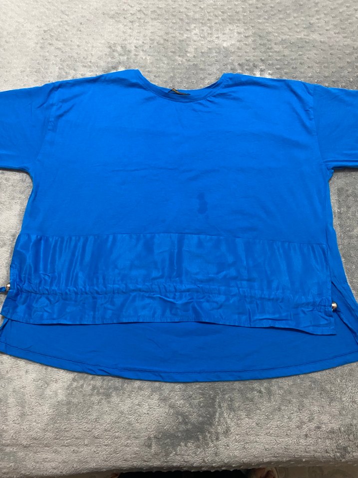 Mavi, kısa kollu, yuvarlak yakalı, keten kumaştan yapılmış bol kesim kadın tişörtü. Bel kısmında parlak volan detayı ile günlük kullanım için uygundur.