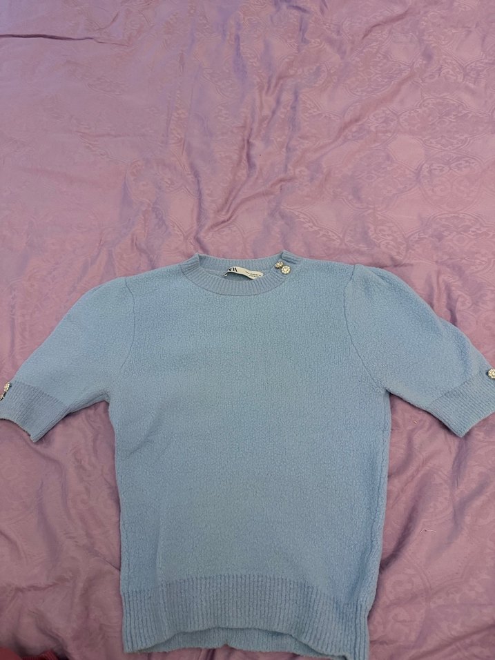 Pastel mavi, kısa kollu, yuvarlak yaka, fitted triko kazak. Rahat ve şık, günlük kullanım için uygun.