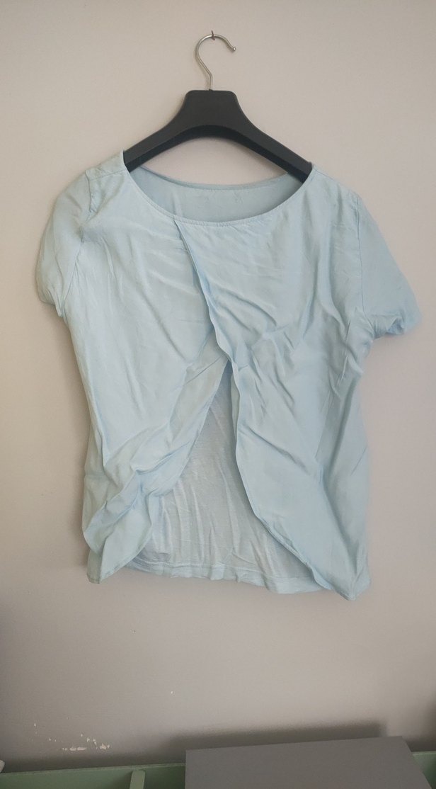 Pastel mavi renkte, kısa kollu, yuvarlak yakalı, keten kumaştan, bol kesim ve drapeli kısa bluz.