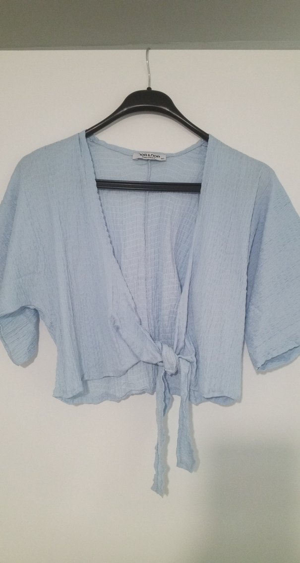 Açık mavi keten bluz, kısa kollu ve bol kesim. V yaka ve düğmeli ön kısmı bağlamalı detaylı, günlük kullanıma uygun. hiç ama hiç kullanılmadı
