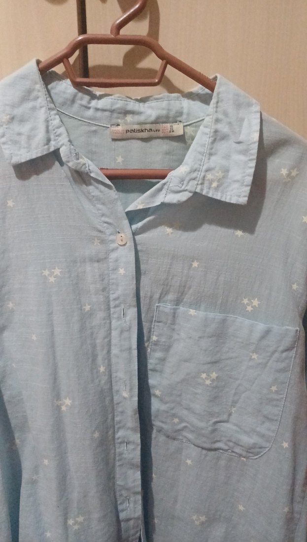 Mavi keten kumaştan, kısa kollu, düğmeli ve yakalı gömlek. Hafif yıldız desenli, rahat ve günlük kullanıma uygun.Cok az giydim temiz yeni Rengi SOLUK CIKMIS