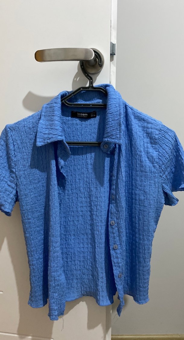Mavi keten gömlek, kısa kollu, yakalı ve düğmeli. Rahat kesimli ve parlak dokulu, günlük rahat kullanım için uygun.